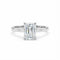The Clairmont Emerald Solitaire features a slender, highly polished band in 18K white gold, creating a sleek and balanced frame for the center stone. The emerald-cut lab-grown diamond is set vertically and exposed in a delicate four-prong setting.