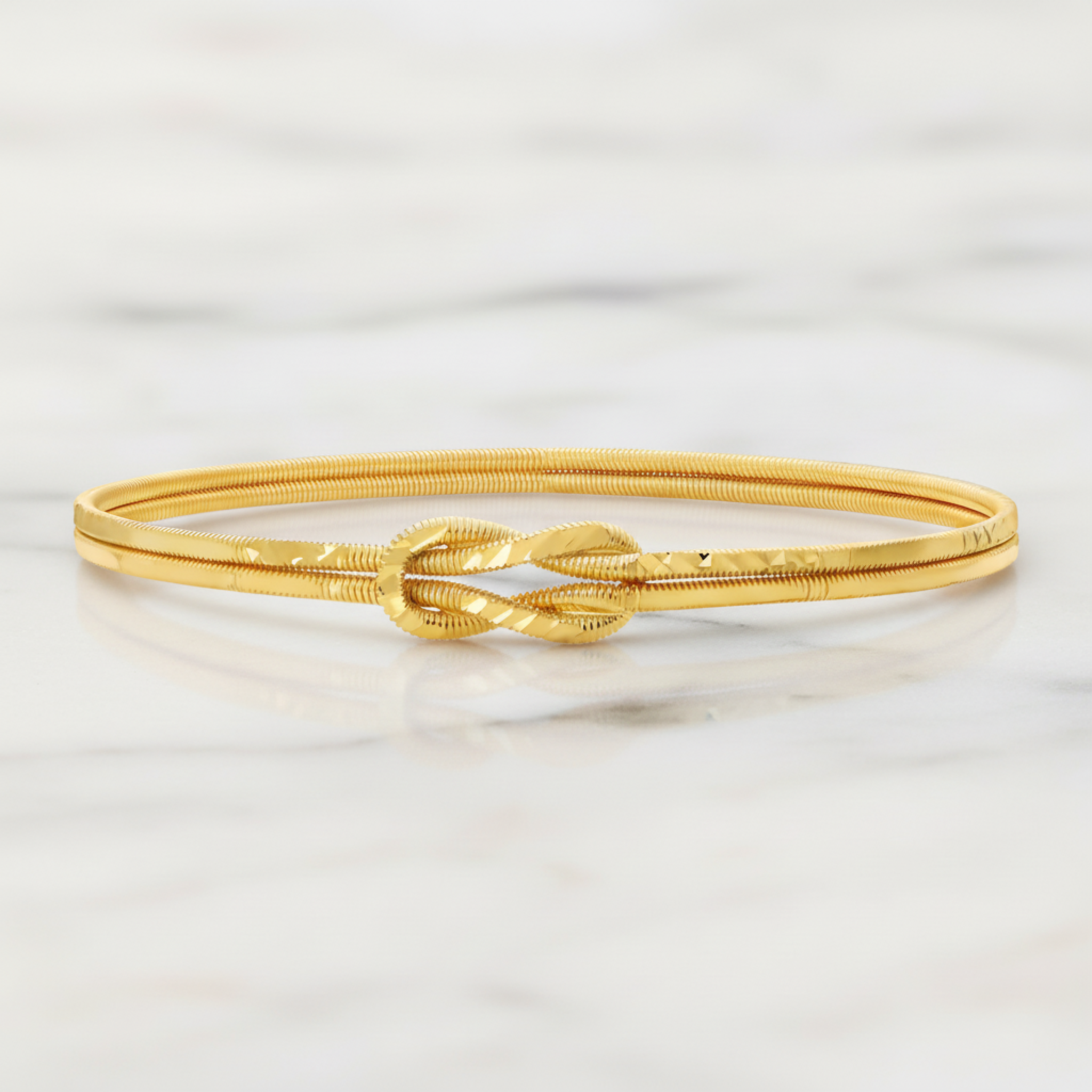 The delicate love knot design represents strength and harmony, while the 14k gold-plated finish adds a luxurious shine.