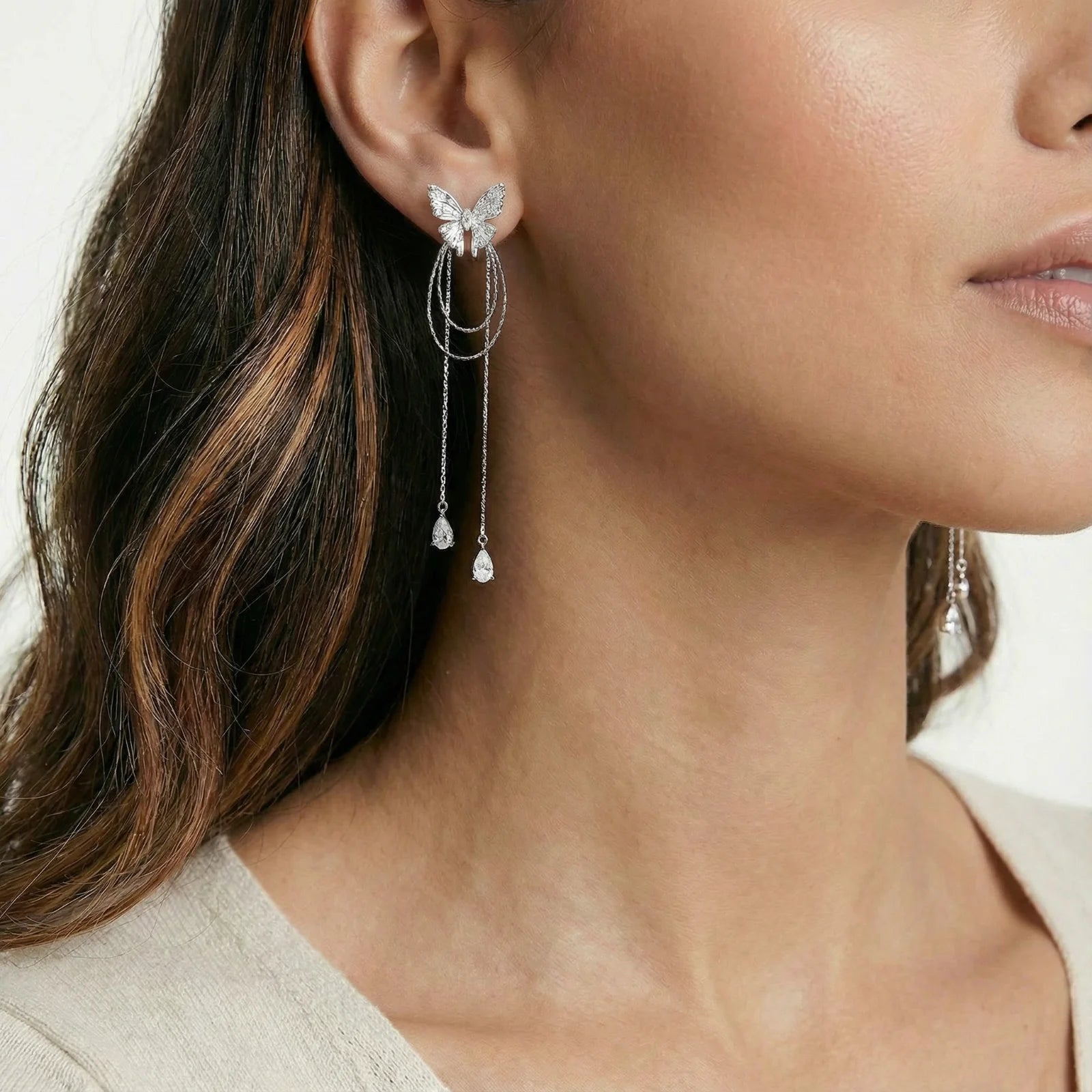 De délicats papillons ornés de zirconiums cubiques étincelants reposent sur de longues et gracieuses chaînes à maillons qui épousent élégamment chaque mouvement. La fluidité des lignes confère au bijou une allure légère et onirique.