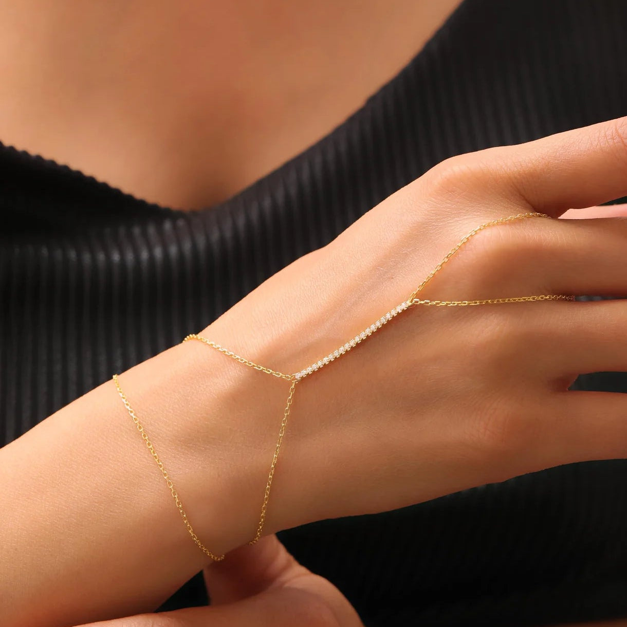 Luna Pavéa est un délicat collier de main au design élégant et équilibré. Une fine chaînette relie le doigt au poignet, ornée d'une rangée centrale de pierres scintillantes qui captent subtilement la lumière.