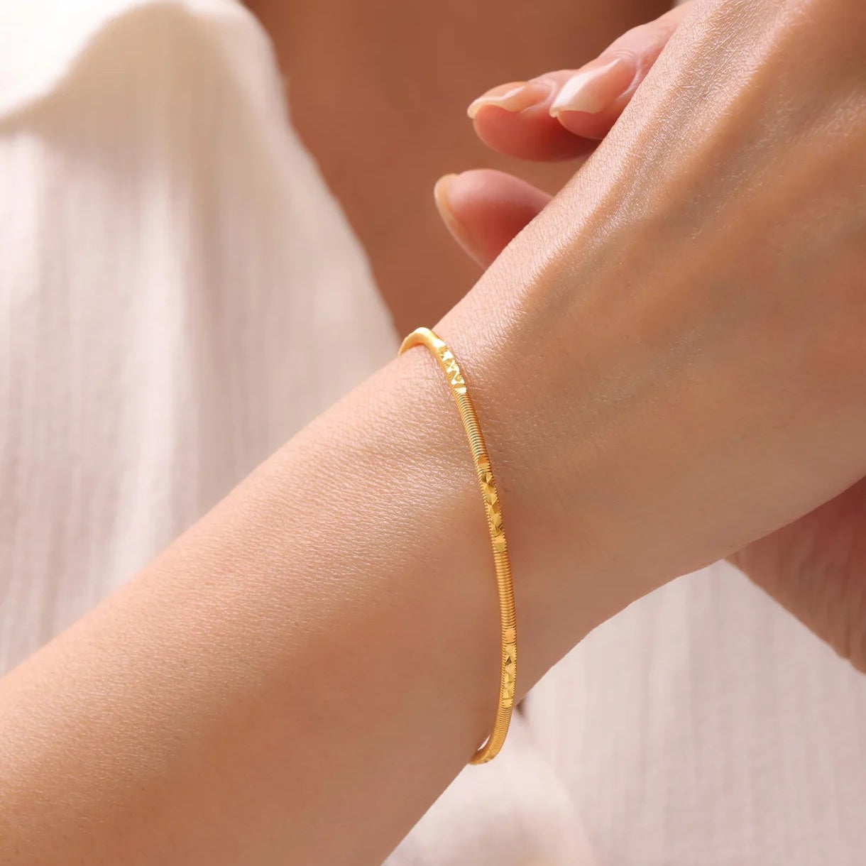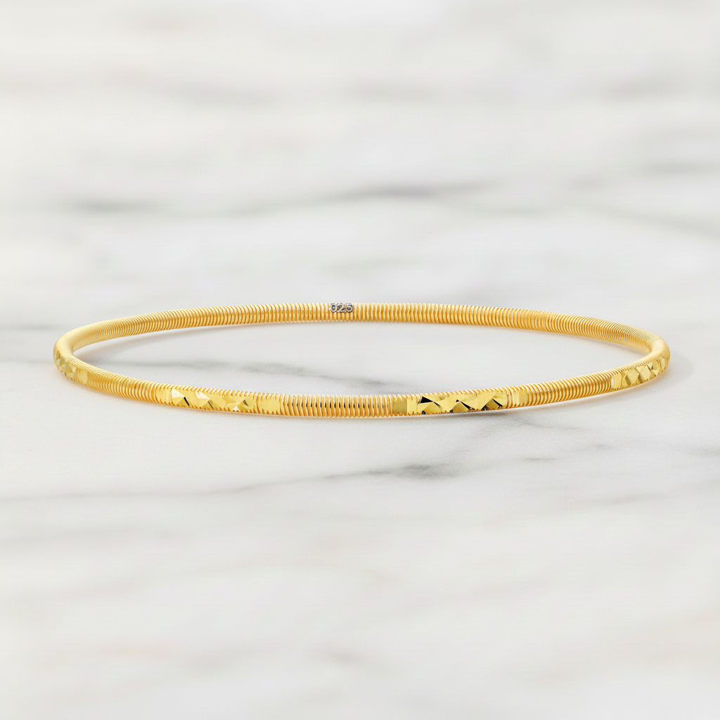 Het oppervlak is afgewerkt met afwisselend fijn geribbelde en subtiel gefacetteerde zones, wat zorgt voor een gelijkmatige lichtreflectie. De armring heeft een uniforme goudkleurige uitstraling zonder zichtbare stenen of onderbrekingen.